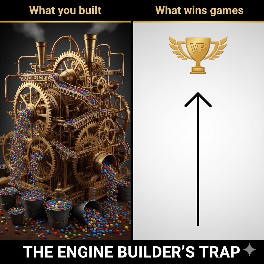 I claim this is a real bias rather than a random mistake/error or “skill issue” as the kids say. You can in fact imagine the opposite issue: people bias too much towards the endgame/victory conditions and don’t invest enough resources into building up their engine. You can imagine it, yet in practice I almost always see people systematically biased in favor of spending too much time on engines, and almost never too much time spent on trying to win.