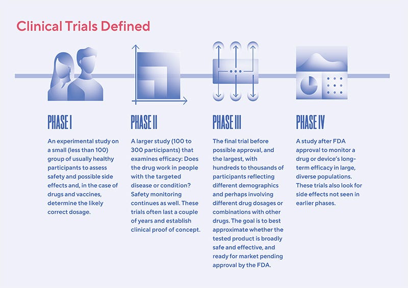 Phase 2: Larger study of a few hundred to few thousand people, to test initial signs of drug/vaccine efficacy2 and further track side effects.